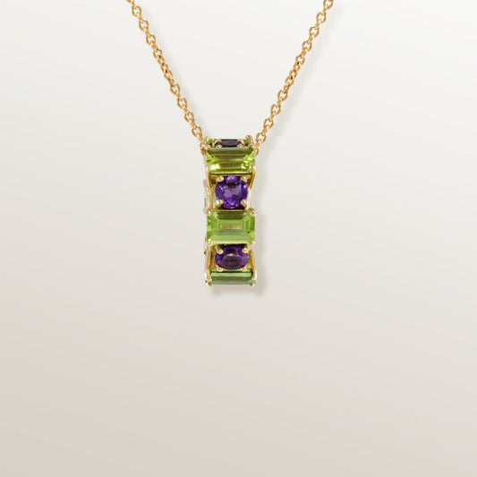 YELLOW GOLD, GREEN PERIDOTS AND AMETHYSTS PENDANT - RAINBOW