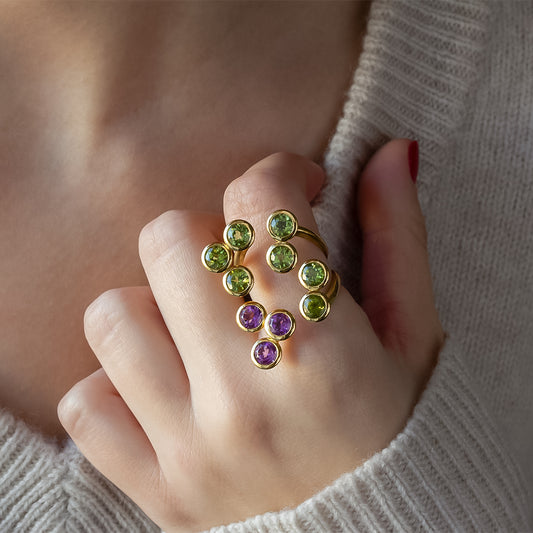 YELLOW GOLD VERMEIL 7 ROUND PERIDOTS AND 3 AMETHYSTS RING - MIX