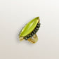 Yellow gold Vermeil* ring featuring an apple-green coloured marquise-cut cabochon agate, surrounded by 18 faceted hematites.