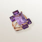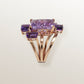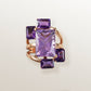 Anillo de oro rosa con Amatista color lila en talla Laser Cut rectangular en el centro y 4 piedras laterales Amatista color morado intenso.