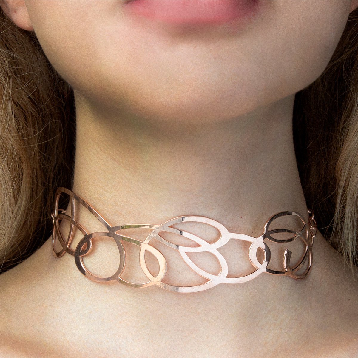 Collar tipo "choker" de Oro Vermeil* rosa. Visualmente ligero, por su calado en forma de laberinto, siguiendo un único trazo continuo. Ancho 3cm. Con cadena ajustable y cierre de mosquetón.